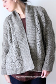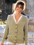 Вам потребуется: пряжа (55% хлопка, 45% вискозы, 135 м/50 г) – 450 (500) 550 г зеленовато-бежевой; спицы № 3 и 4; круговые спицы № 3; 6 пуговиц диаметром по 27 мм.