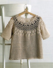 Наберите петли от горловины и вяжите в три ряда, создавая свежую, лоскутную кокетку. Эта элегантная блуза с короткими рукавами выполнена в мягком бежевом цвете, приятном на ощупь. Небольшие точечные узоры, обрамляющие воротник, нижний край и манжеты, выглядят очаровательно.