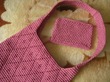 Размеры: длина по верху 58 см, ширина стороны 39 см, ширина по центру 26 см, для веревочек по 30 см (80 воздушных петель, 1 ряд сбн, 1 ряд соед.столбики с накидом).