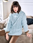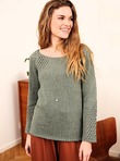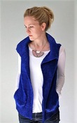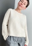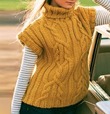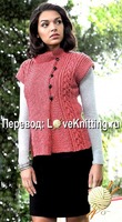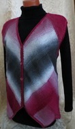 «Косы» и полосы структурного узора расположены на вязаном жилете горизонтально за счет изменения направления вязания. Модель вяжется единым полотном, имеет плечевые скосы для лучшей посадки. Все края отделаны широкими полосами резинки.