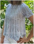 Отдыхайте стильно в теплые летние дни в этом легком топе от Энникен Эллис. Изделие вяжется по кругу сверху вниз, с круглой кокеткой и короткими рукавами. Дизайн топа дополнен красивой кружевной каймой по нижнему краю, что придает изделию завершающую нежность. Показанное изделие связано из смеси шерсти и хлопка, что делает этот топ еще более мягким и стильным.