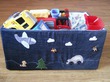 Сшила чехол на коробку для игрушек. Со всех сторон кармашки, крепится шнурками, можно снять для стирки. Есть ручка что бы удобно было носить. Дочка нарисовала на ней картинки акриловыми красками. Сыночку очень нравится рассматривать картинки, вытаскивать игрушки из кармашков и теребить шнурки и пуговки.