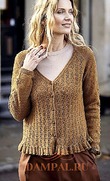 Летняя модель из смесовой хлопковой пряжи светло-серого оттенка подойдет к разным стилям. Узкие планки застежки вяжутся вместе с полочками и переходя тв отделку выреза горловины.