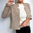 Поклонники стильных жакетов, обратите внимание - эта невероятная модель тонко подобранного оттенка белого дыма бесспорно украсит свою хозяйку, ведь она для того и создана! Да, это нечто. Рустикальная геометрия, стилизованная под брюггское кружево, будет идеально сочетаться со всеми вашими основными летними и весенними вещами.