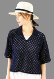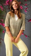 Прямой фасон до пояса, длинные рукава, круглая ажурная кокетка и широкий вырез горловины.