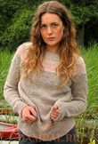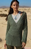 Вязаный пуловер с плетеным узором посередине и поперечной резинкой по бокам связан спицами из шерсти альпака на спицах № 6,5.