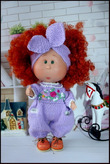 Подарили внучке на Новый год чудесную малышку Мию мини.Рост куколки 23 см.Теперь привезли ее мне,чтобы я навязала для нее разной одежки.Начало положено-связался комбинезончик и повязка на голову.Оставался небольшой клубочек сиреневх ниточек Карамелька от Камтекс,вот я и решила их пристроить.Комбинезон вязала спицами 3 мм,повязку спицами 2 мм.Цветочки вышивала мулине. Сделала прорезные кармашки.