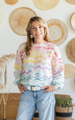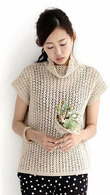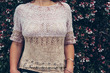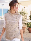 Лиф, связанный горизонтально полосатым ажурным узором, при ношении расширяется у выреза горловины, образуя глубокий V-образный вырез. Носите его со спущенными плечами для расслабленной и комфортной посадки.