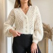 Укороченный кардиган с геометрическим узором, проще говоря - кофточка зацепила женственным и стильным фасоном с прямыми акцентными рукавами на манжете и красивыми пуговицами из натурального жемчуга.