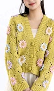 Этот кардиган состоит из основной части, рукавов и общего края, связанного крючком. Как основная часть, так и рукава выполнены из отдельных цветочных мотивов, соединенных вместе. Мотивы рукавов вяжутся крючком так же, как и мотивы основной части, за исключением того, что мотивы рукавов имеют на один ряд больше, чем мотивы основной части.
