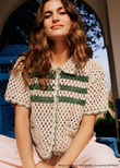 Материал: качественный хлопок Landlust от Lana Grossa (100% (органический) хлопок, LL = ок. 115 м/50 г): ок. 400 (450) г натурального цвета (цвет 3) и ок. 50 г изумрудно-зеленого цвета (цвет 9); 1 крючок для шерсти № 3,5; 5 перламутровых пуговиц натурального цвета, Ø 18 мм.
