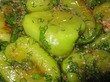 Перцы помыть(не чистить), обжарить на растительном масле, сложить в посуду, залить соком лимона, растительным маслом, на котором жарились перцы, залить протертыми помидорами, смешанными с давленным чесноком, солью, сахаром, черн.мол.перцем, добавить много зелени, все перемешать, положить под гнет на 2 часа.