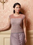 Приталенный летний топ связан из нитей разных оттенков и дополнен сетчатой кокеткой.