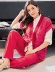 «Косы» и полосы структурного узора расположены на вязаном жилете горизонтально за счет изменения направления вязания. Модель вяжется единым полотном, имеет плечевые скосы для лучшей посадки. Все края отделаны широкими полосами резинки.